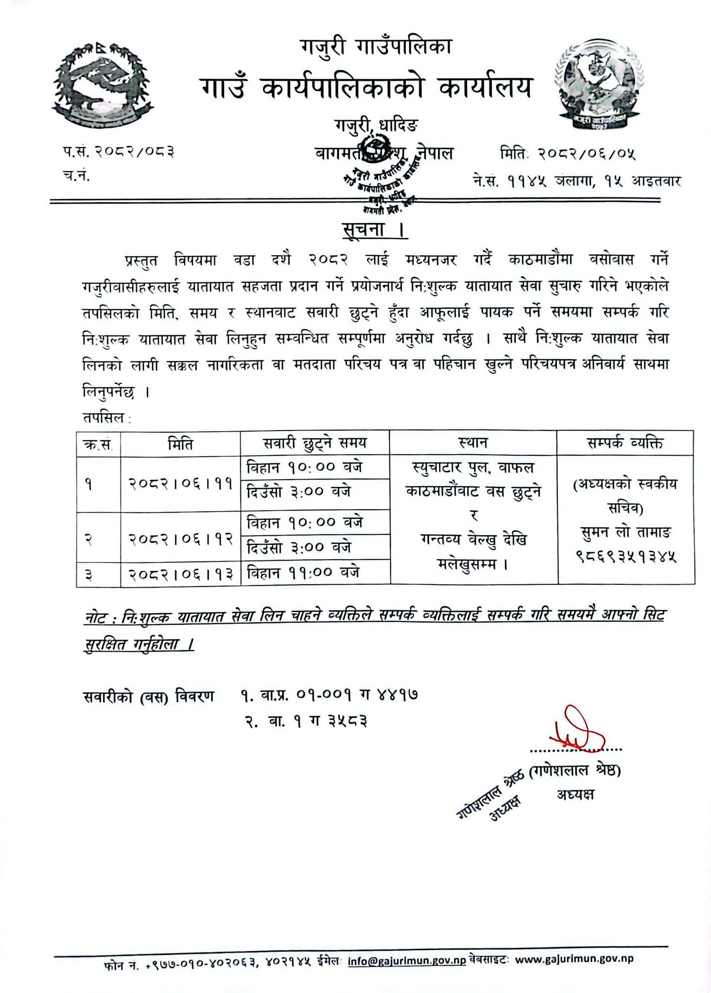 गजुरी गाउँपालिकाका अध्यक्ष गणेशलाल श्रेष्ठले सबै इच्छुक यात्रुहरूले समयमै सम्पर्क गरी आफ्नो सिट सुरक्षित गर्न आग्रह गर्दै सेवा उपलब्ध गराइएको जानकारी दिएका छन्।