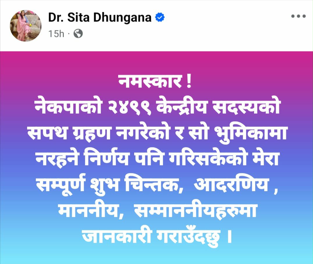 सामाजिक सञ्जाल फेसबुकमा लेखिएको स्टाटसमा ढुंगानाले उल्लेख गर्नुभएको छ,“नेकपाको २ हजार ४९९ सदस्यीय केन्द्रीय समितिको सपथ ग्रहण नगरेको र सो भूमिकामा नरहने निर्णय गरिसकेको कुरा मेरा सम्पूर्ण शुभचिन्तक,आदरणीय,माननीय तथा सम्माननीयहरूमाझ जानकारी गराउँदछु।”
