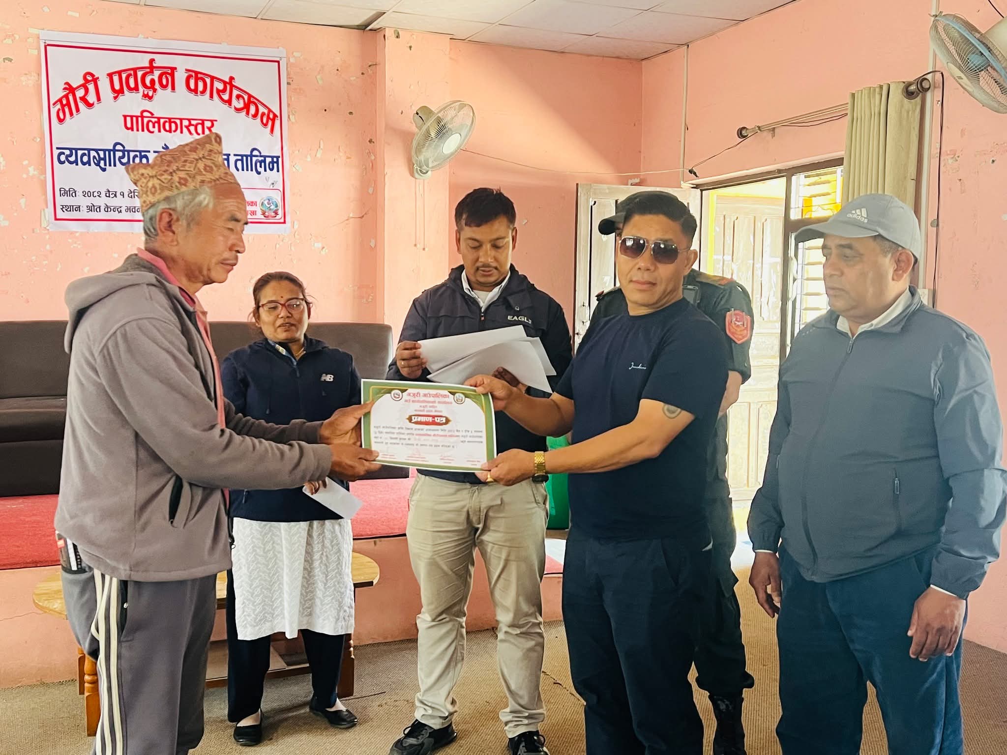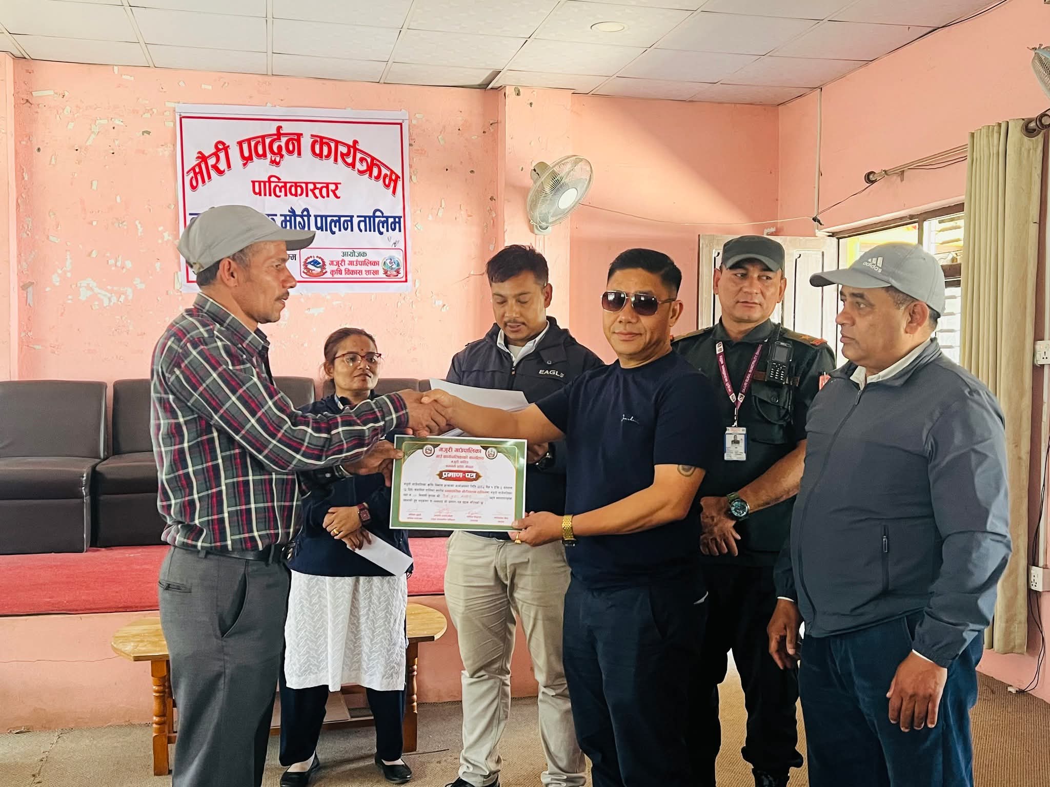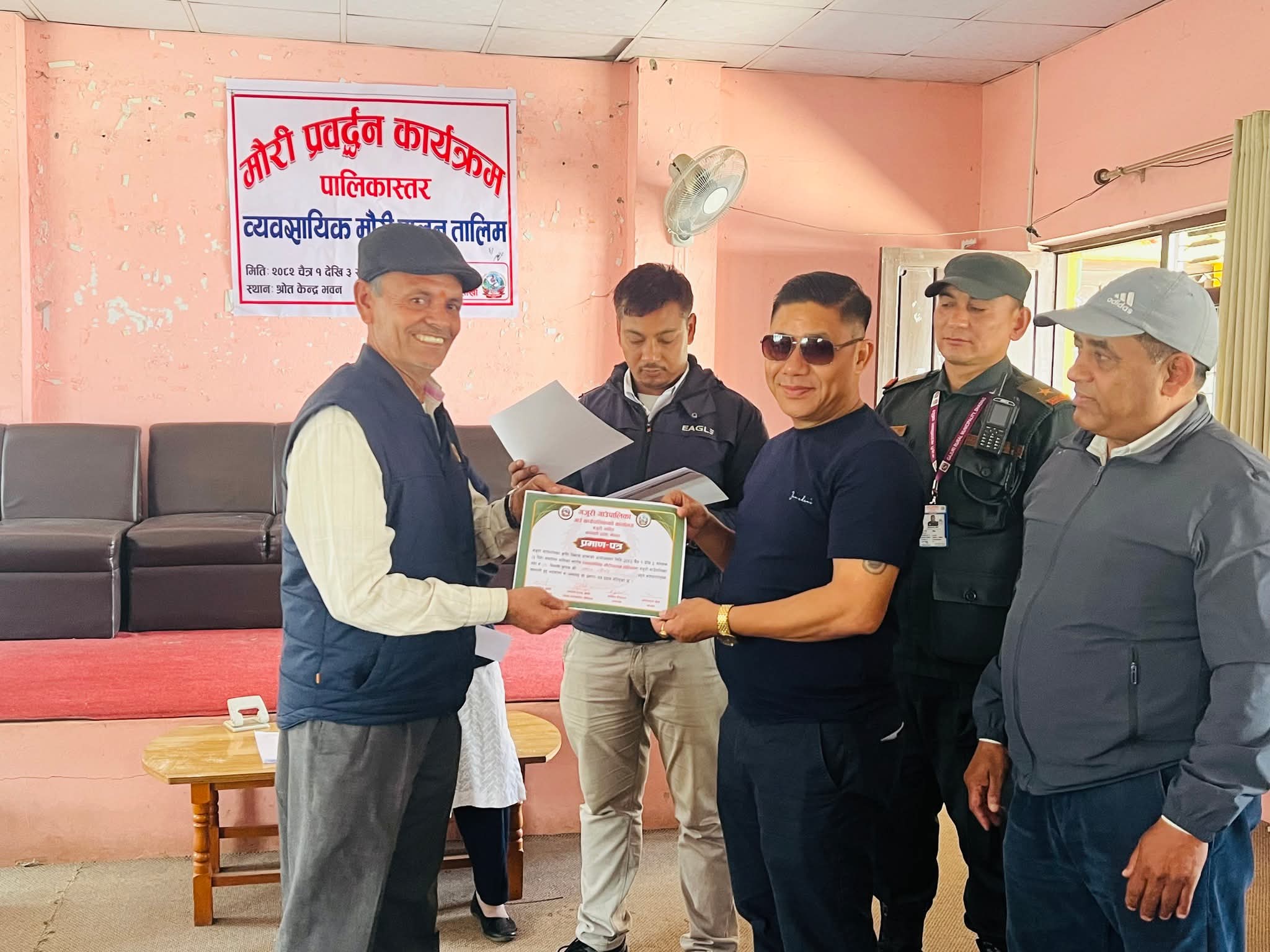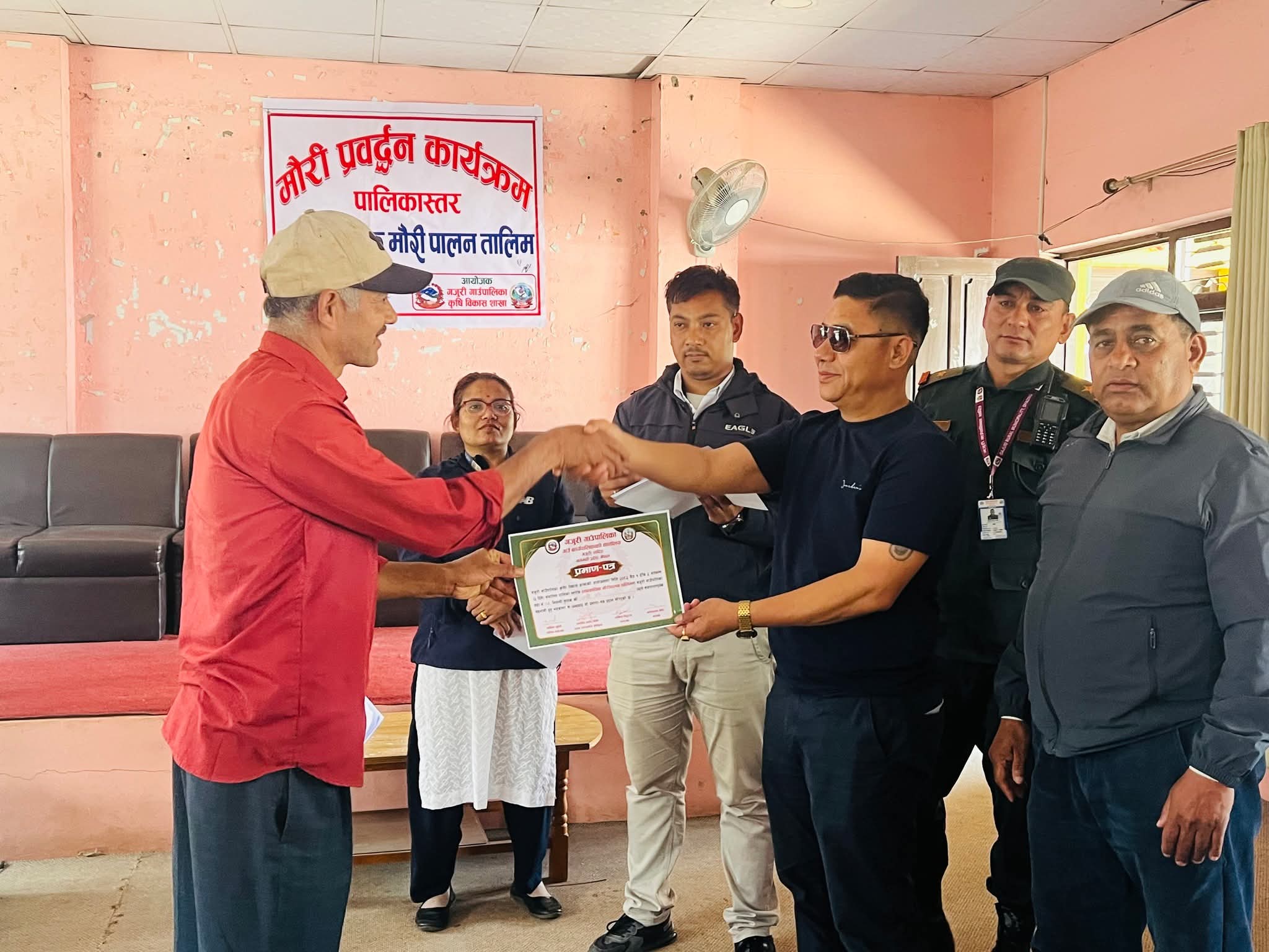 धादिङ — गजुरी गाउँपालिकामा कृषि शाखाको आयोजनामा चैत्र १ गते देखि ३ गतेसम्म सञ्चालन भएको व्यावसायिक मौरीपालन तालिम सफलता पूर्वक सम्पन्न भएको छ। कृषकहरूलाई आधुनिक सीप,प्रविधि तथा ज्ञान प्रदान गरी मौरीपालनलाई लाभदायक र दिगो व्यवसायका रूपमा विकास गर्ने उद्देश्यले तालिम आयोजना गरिएको हो।
